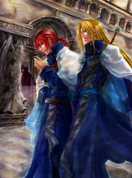 ![]() [謁見の間へ] 縮小したら顔が潰れましたクレイとジール。 宮廷内でもこの二人は普段どおり何も変わらないかんじ。 クレイは宮廷嫌い。ジールも同じだけどご婦人には紳士的になります。 (加工版SSvol.3の10月号掲載) (06.2/28にTINAMIさんで今日の一枚に掲載) CG:CorelPainterClassic1.0J、AdobePhotoshop6.0 reusing illustrasions in other websites w/o permisson is strictly PROHIBITED |