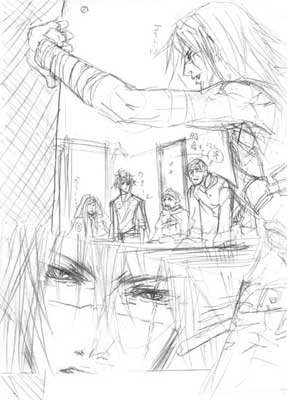 ▼イラスト構図ラフ/詰めた後(拡大コピーしトレース用のため結構まじ描きです)